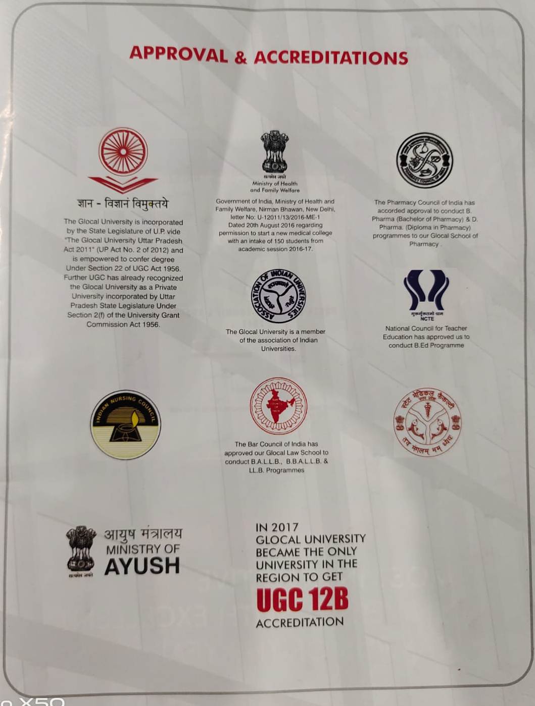 • Recognized by UGC under Section 22 of UGC Act 1956 and established by the Glocal University Act, 2011 (UP Act no. 2 of 2012) (as passed by the Uttar Pradesh legislature)