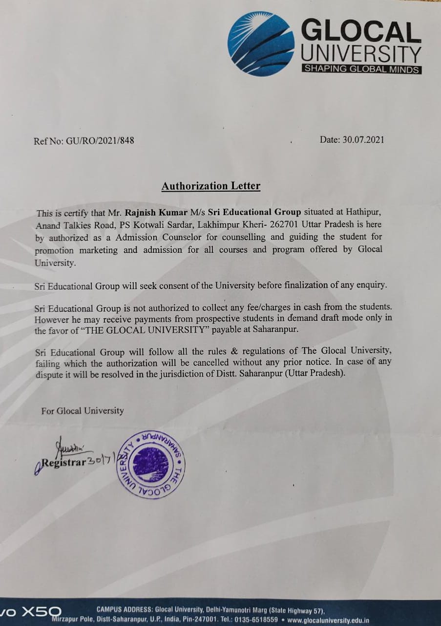 INFORMATION CENTRE AUTHORITY LETTER OF GLOCAL UNIVERSITY,SAHARANPUR,U.P.